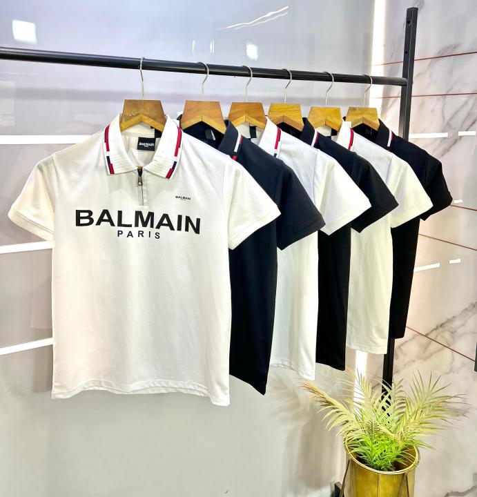 Balmai n Paris Metal Logo Imported Embossed Print Black Collar Neck T-shirt F2832-BL