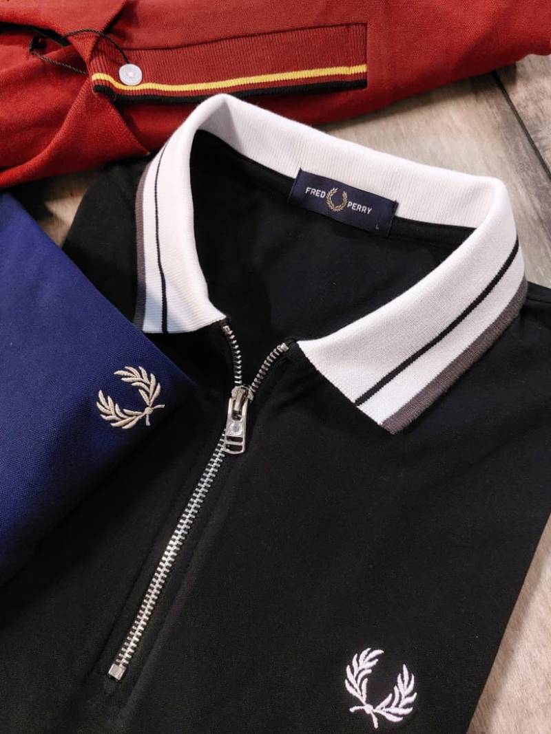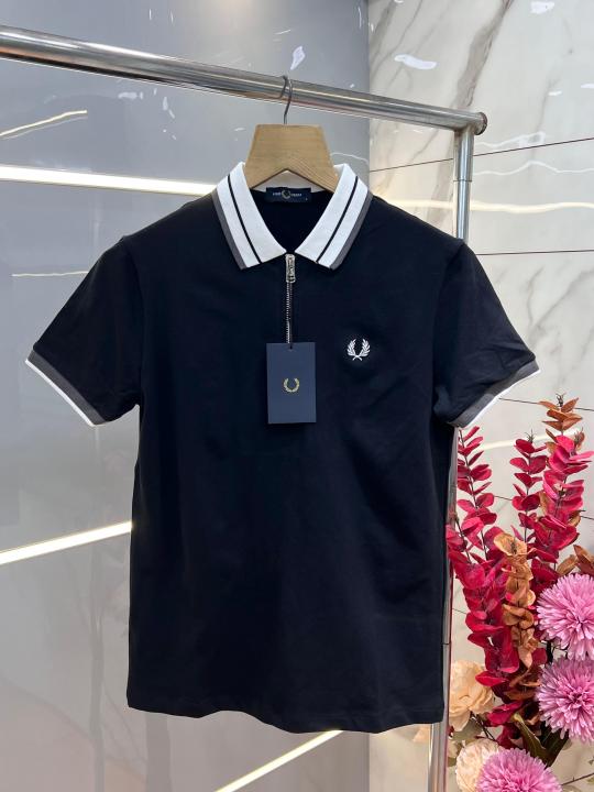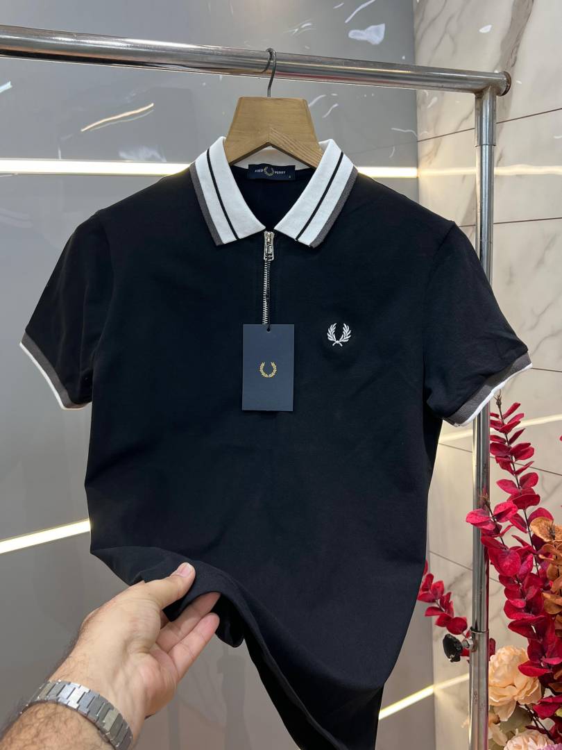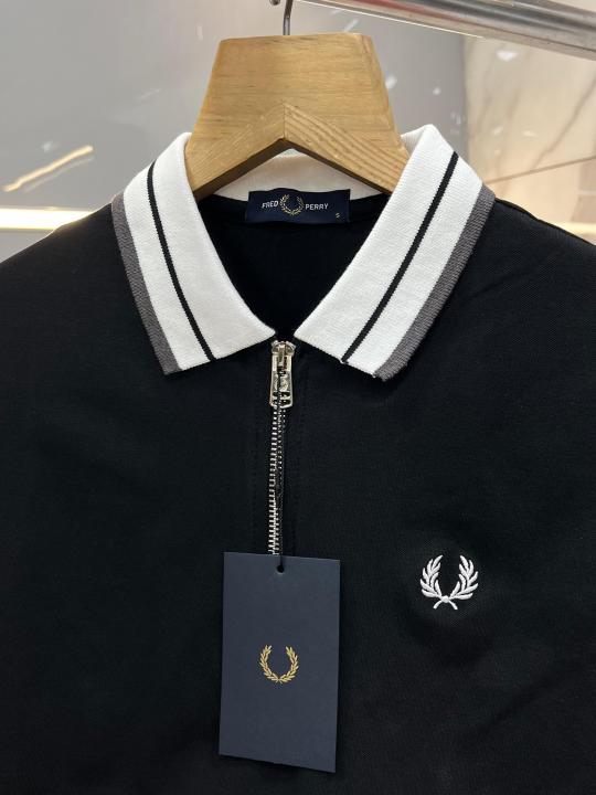 Fred Perr y Black Premium Cotton Lycra Pique fabric Polo Tshirt with Collar Design and Embroidered Logo Zip Style 3380