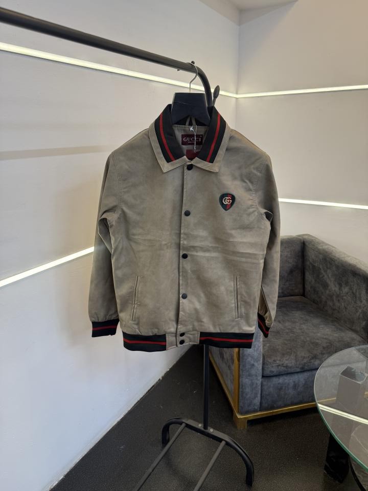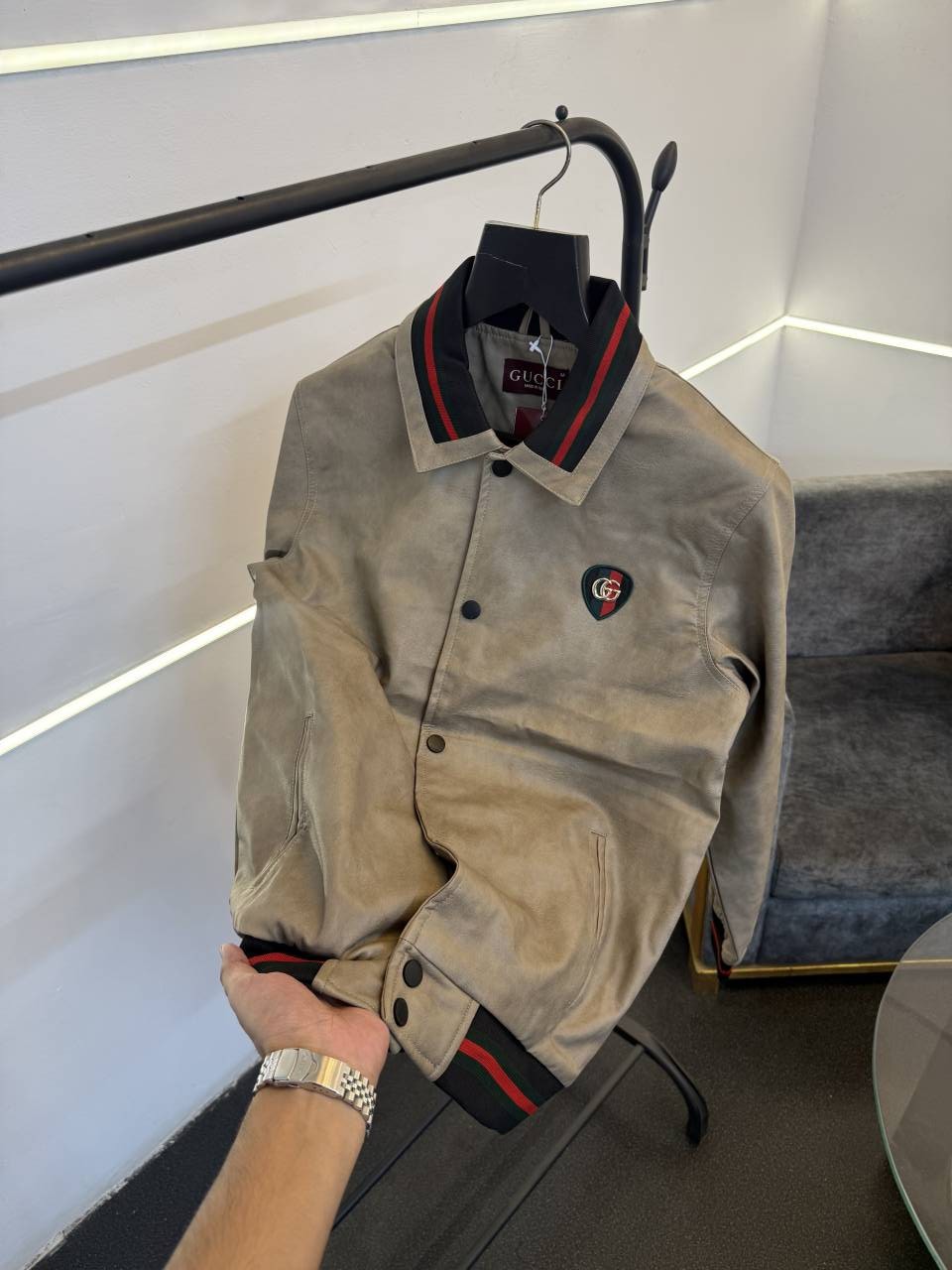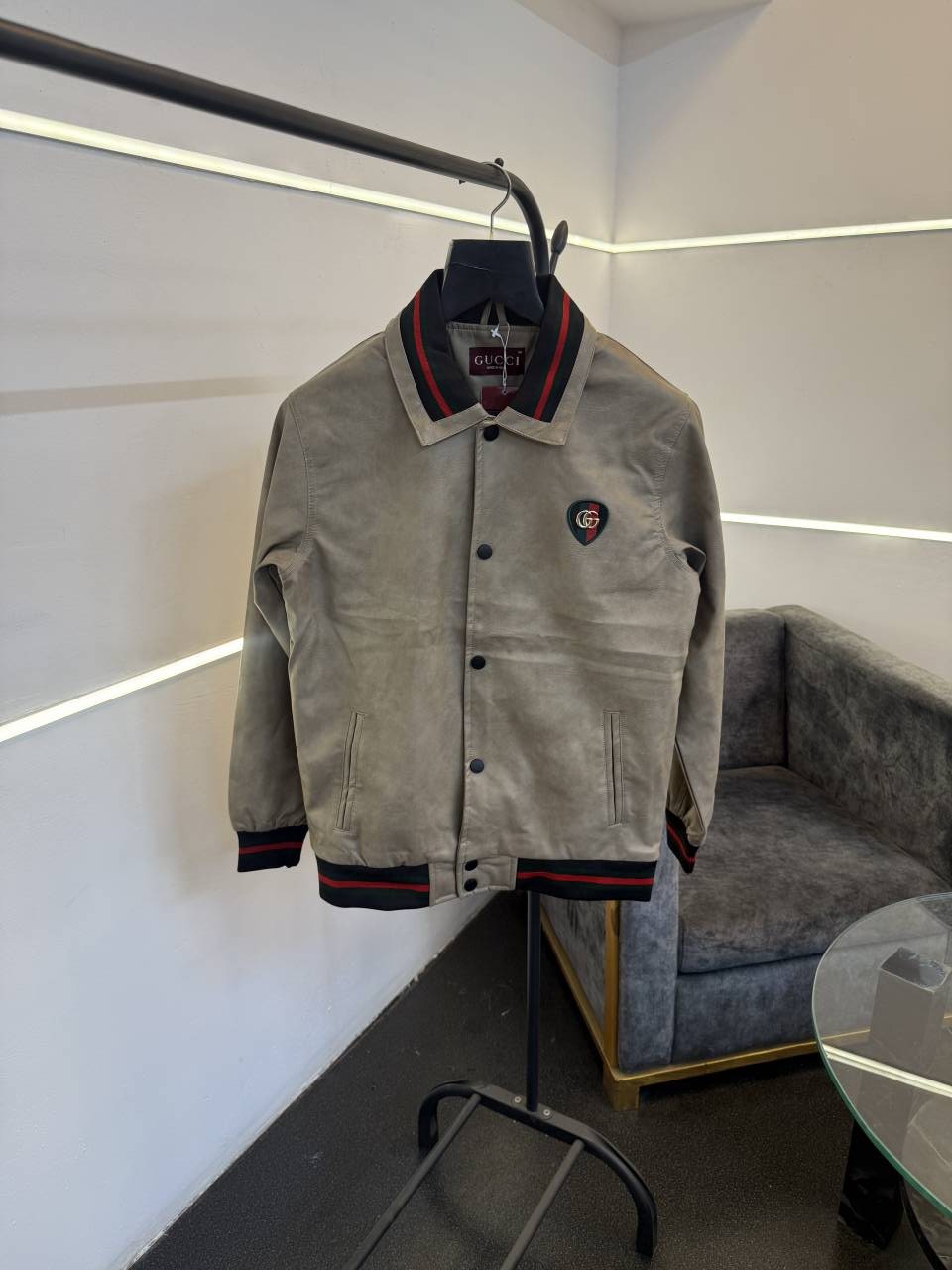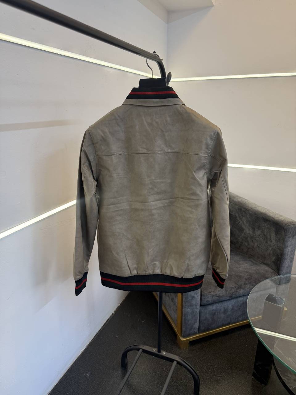 ? *Gucci imported front brand snap button imported varsity style leather jacket with brand zip and front pocket with inside pocket now in stock*?
