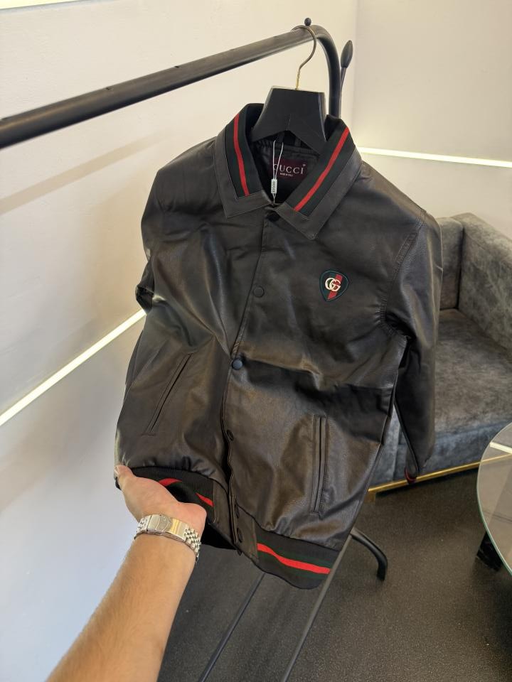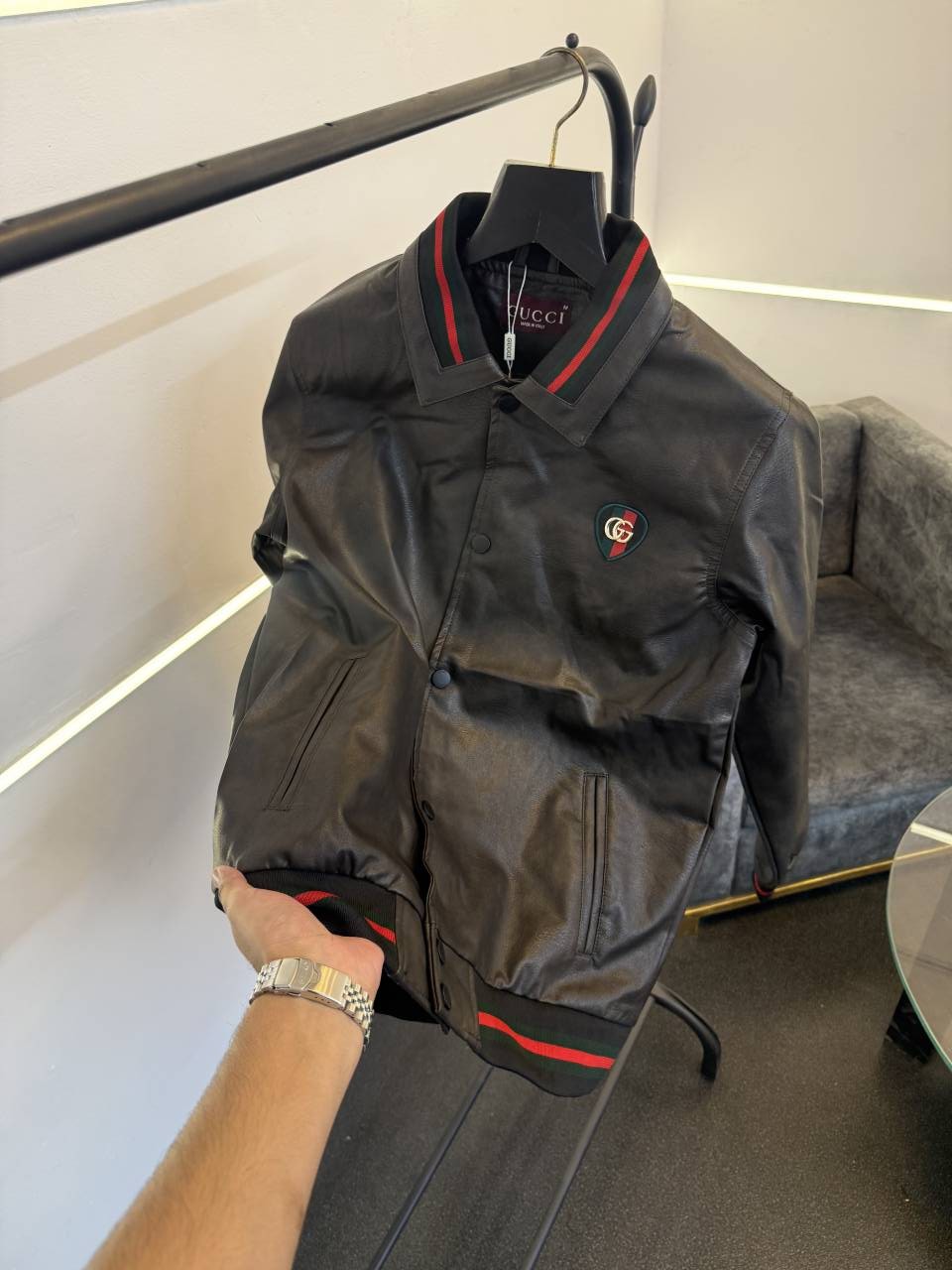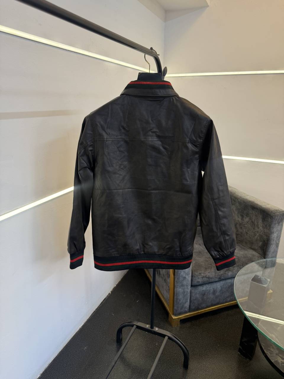? *Gucci imported front brand snap button imported varsity style leather jacket with brand zip and front pocket with inside pocket now in stock*?