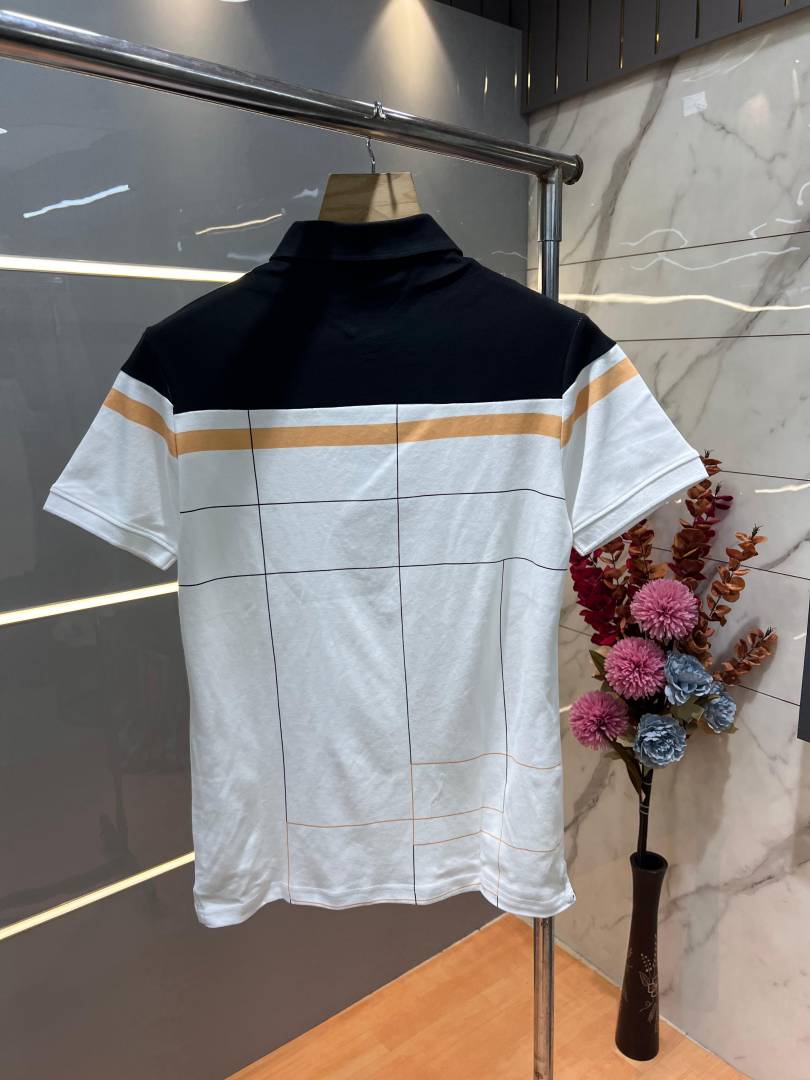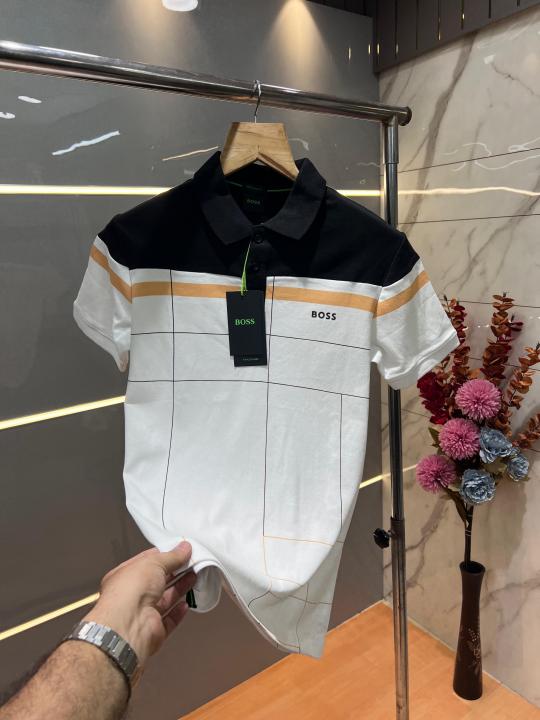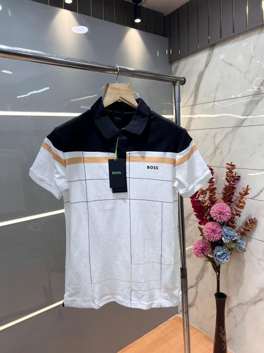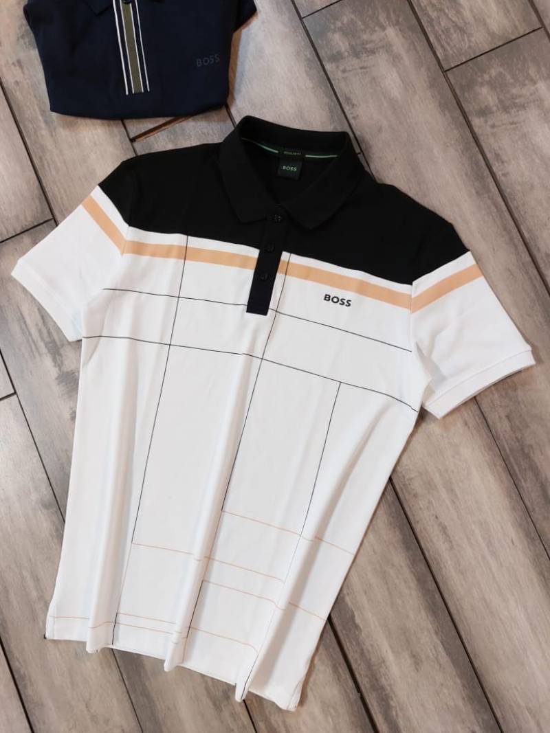 Hugo Bos s Black and White Premium 240 gsm interlock cotton fabric Polo Tshirt with Front Design and Emboss Logo 3174