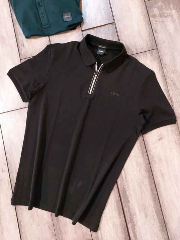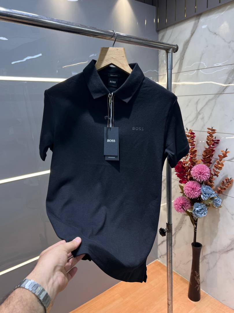 Hugo Bos s Black Premium 240 gsm interlock cotton fabric Polo Tshirt with Collar Design and Emboss Logo Zip Style 3180