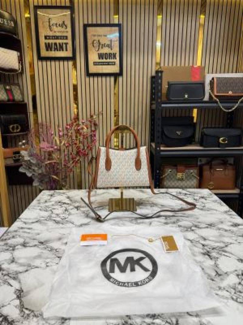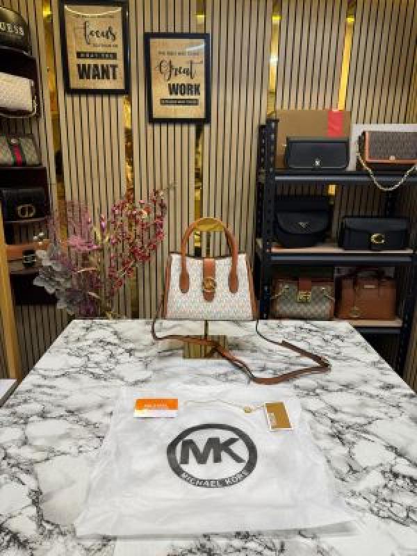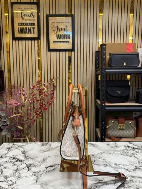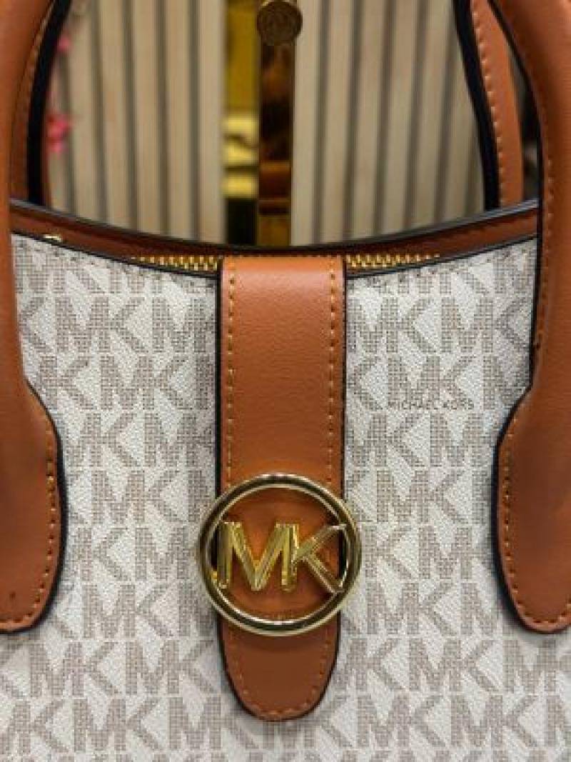 Michael_Kors Logo Signature Satchel Handbag With Dust Bag (Beige)